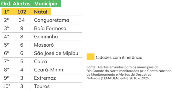 Entre 2016 e 2025, foram emitidos 188 alertas no estado, sendo a maioria relacionada a riscos hidrológicos, como alagamentos e inundações, além de ocorrências geo-hidrológicas, como deslizamentos. Destaque para Natal que recebeu 102 alertas de desastres nesse período. Os dados reforçam a importância do monitoramento contínuo e da articulação entre poder público e comunidades para reduzir riscos e fortalecer a capacidade de resposta nos territórios.