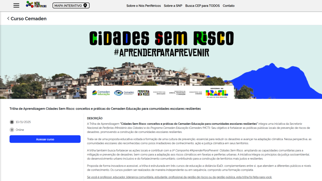 Os cursos na plataforma Nós Periféricos são um passo central desse processo. A trilha de aprendizagem “Cidades sem Risco: conceitos e práticas do Cemaden Educação para comunidades escolares resilientes” reúne três cursos gratuitos, online e certificados, que articulam fundamentos conceituais, metodológicos e participativos para fortalecer ações educativas, comunitárias e territoriais. Ao longo de 120 horas, educadores, mobilizadores e integrantes de coletivos desenvolvem uma compreensão crítica sobre os fatores que produzem e agravam os riscos, aprendem a observar e analisar o território de forma colaborativa e são estimulados a construir estratégias coletivas de prevenção, adaptação e redução de desastres no contexto local.